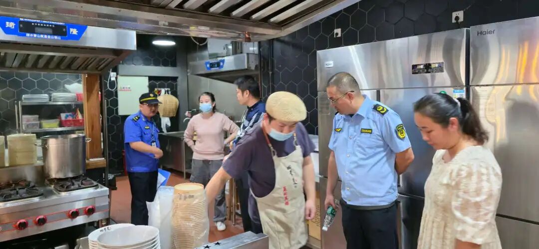 ▲区城管局联合市监、消防部门对四季美汤包开展联合检查。