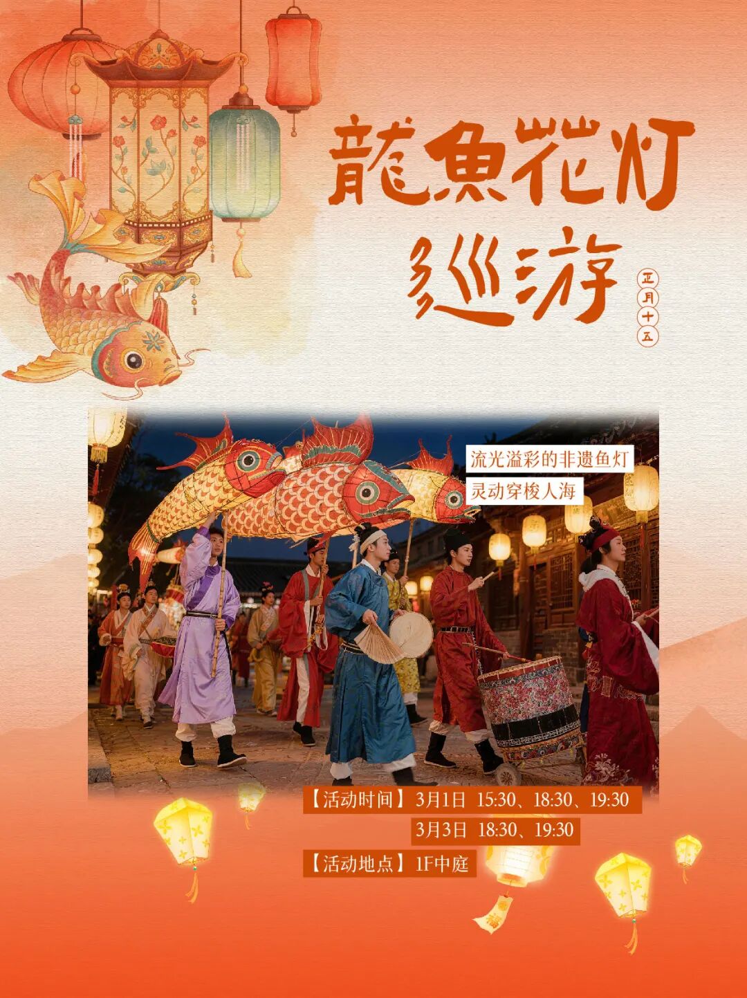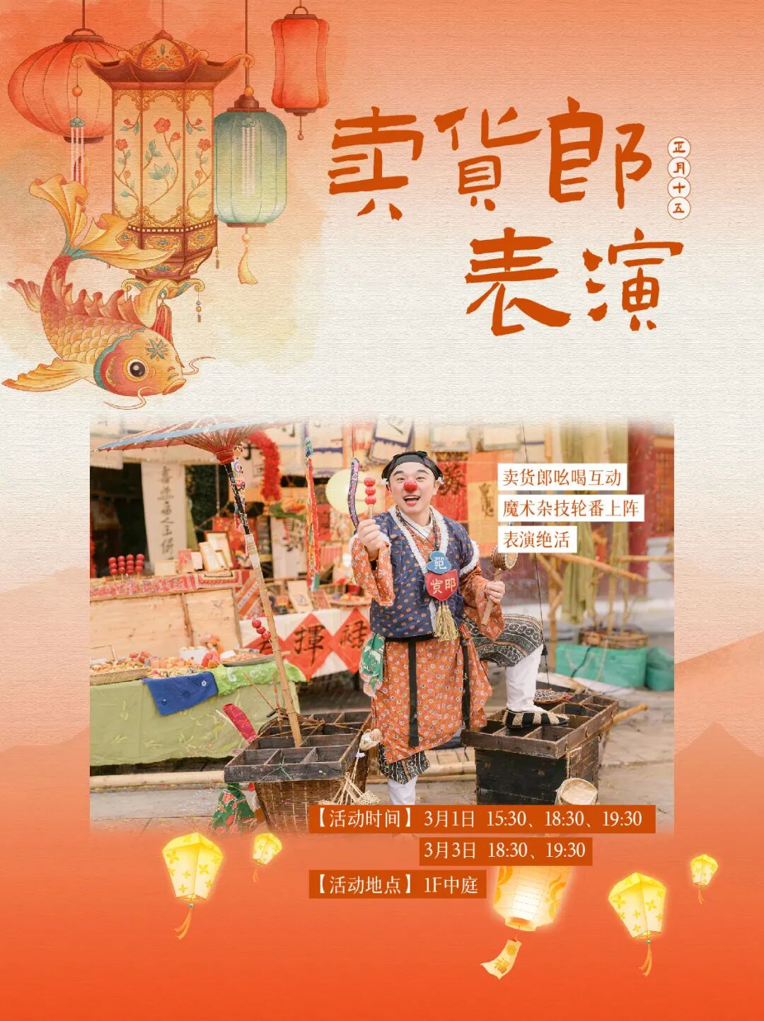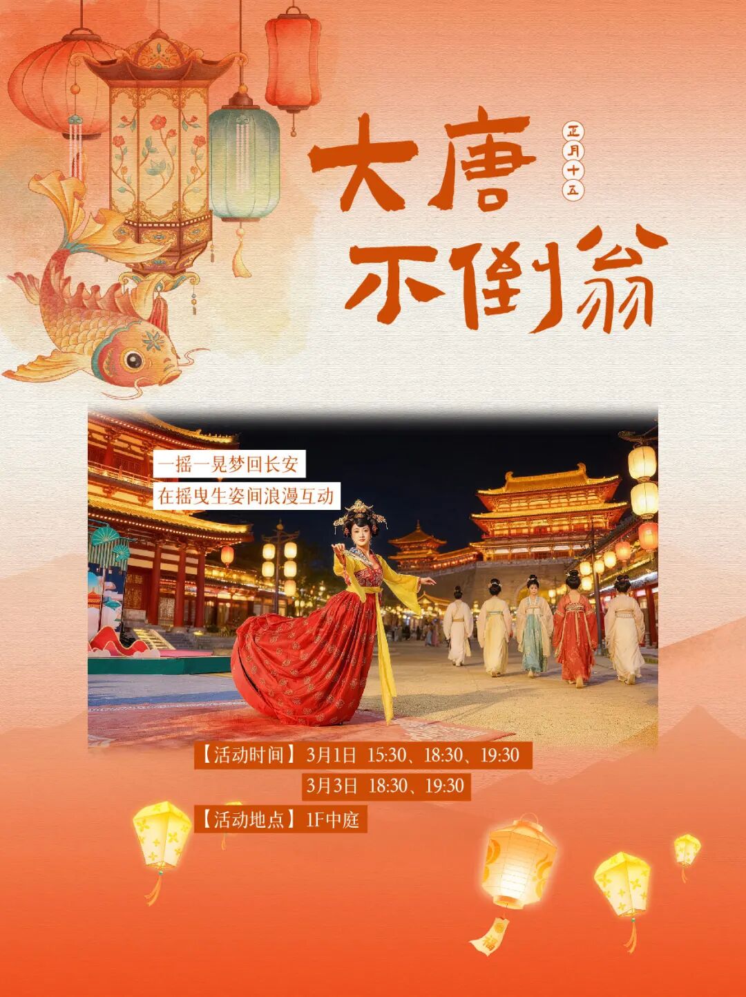 群星城好戏连台,三大表演轮番登场。龙鱼花灯巡游,流光溢彩非遗鱼灯穿梭人海如梦似幻。大唐不倒翁一摇一晃梦回长安,浪漫互动等你邂逅。卖货郎表演,吆喝叫卖+魔术杂技,近距离喜闹元宵。