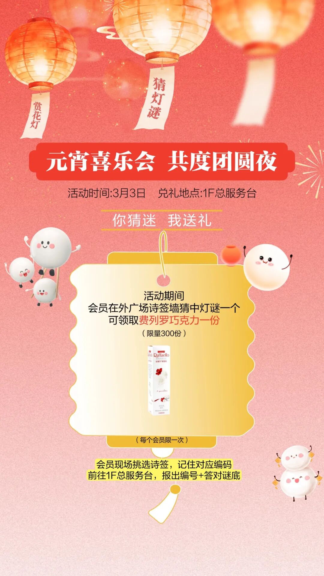中商广场外广场元宵诗签墙惊喜上线,会员挑选诗签,记住编码,前往1F总服务台答对谜底,即可免费领取费列罗巧克力一份。一诗一谜添趣味,答对就把甜蜜带回家。限量300份,先到先得,领完即止!