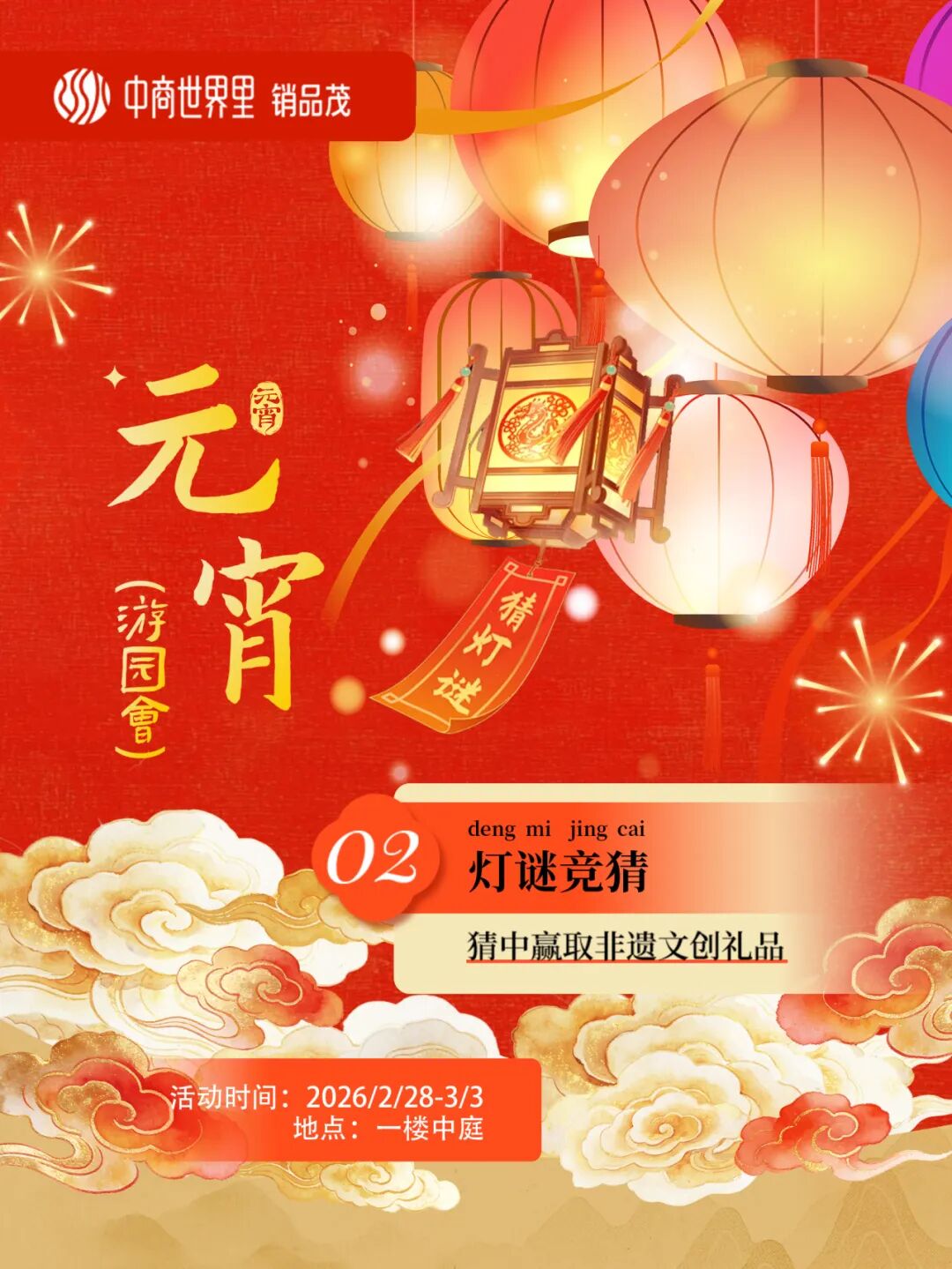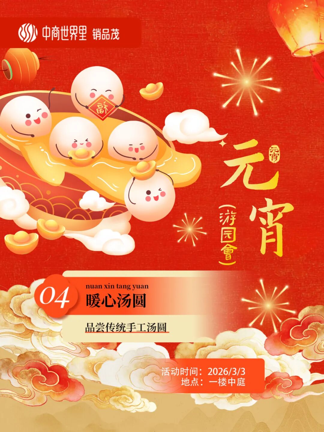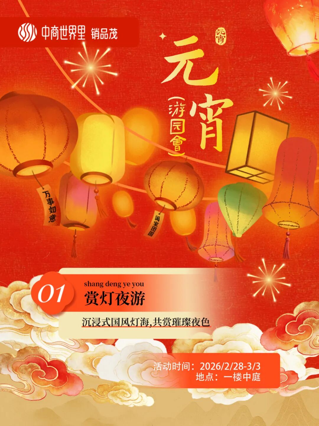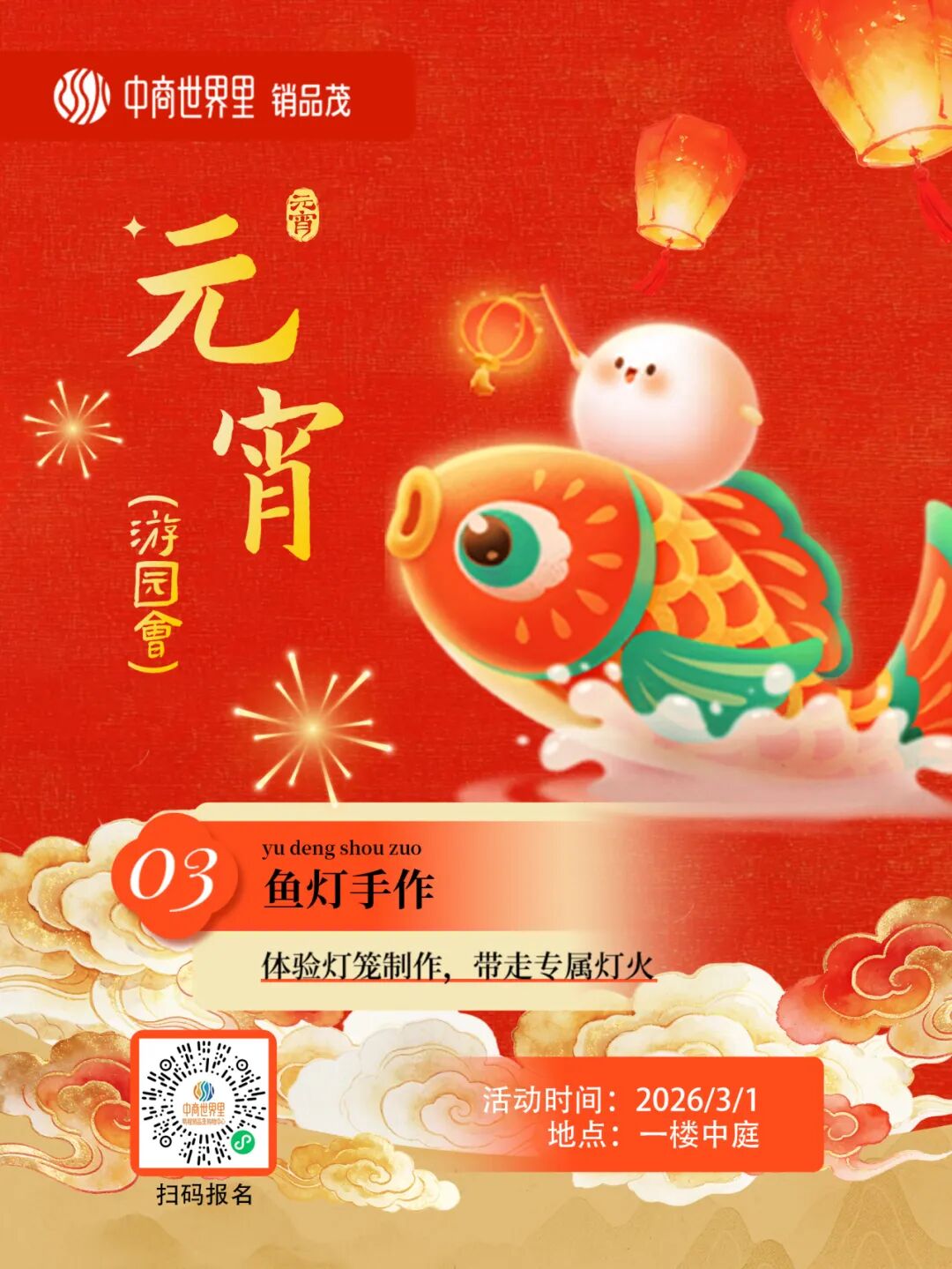 良宵共团圆,灯火耀万家。中商世界里・销品茂邀您共度佳节。即日起-3月3日活动期间,一楼中庭漫步国风灯海,赴一场赏灯夜游之约;参与灯谜竞猜,解锁非遗文创好礼;体验鱼灯手作,亲手打造专属佳节灯火;传统手工汤圆,感受舌尖上的暖意;此外,会员可享免费停车至高5小时福利,邀您携亲伴友,共赴这场兼具传统韵味与互动乐趣的元宵盛会。