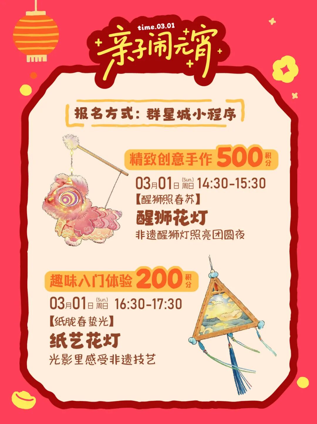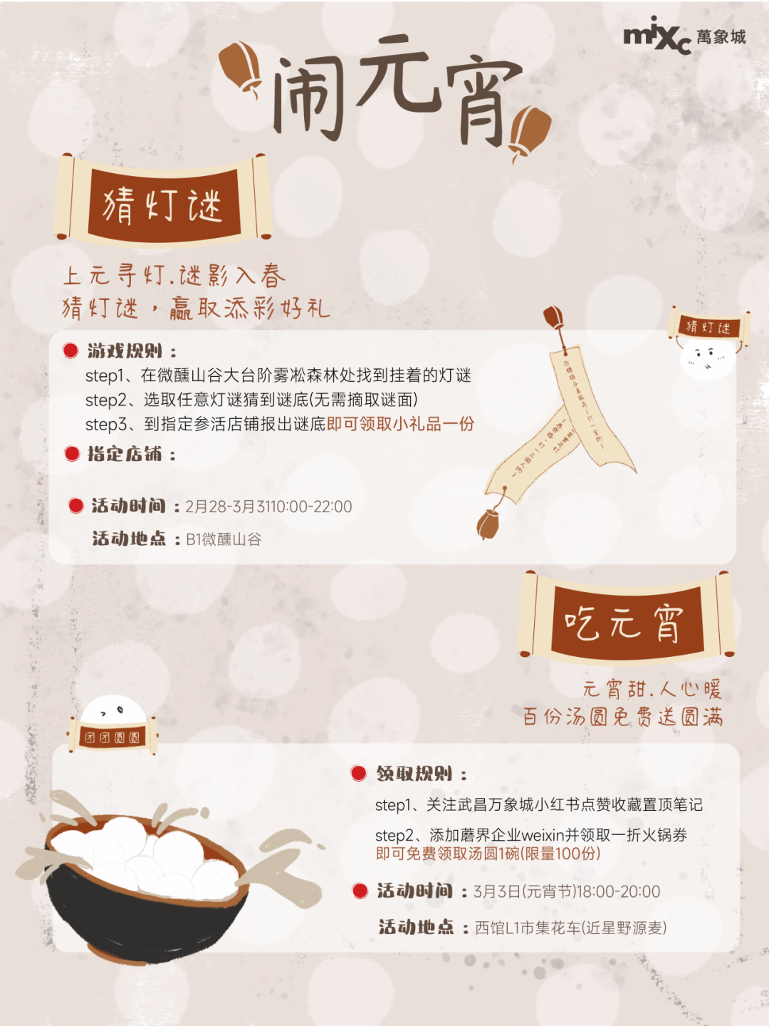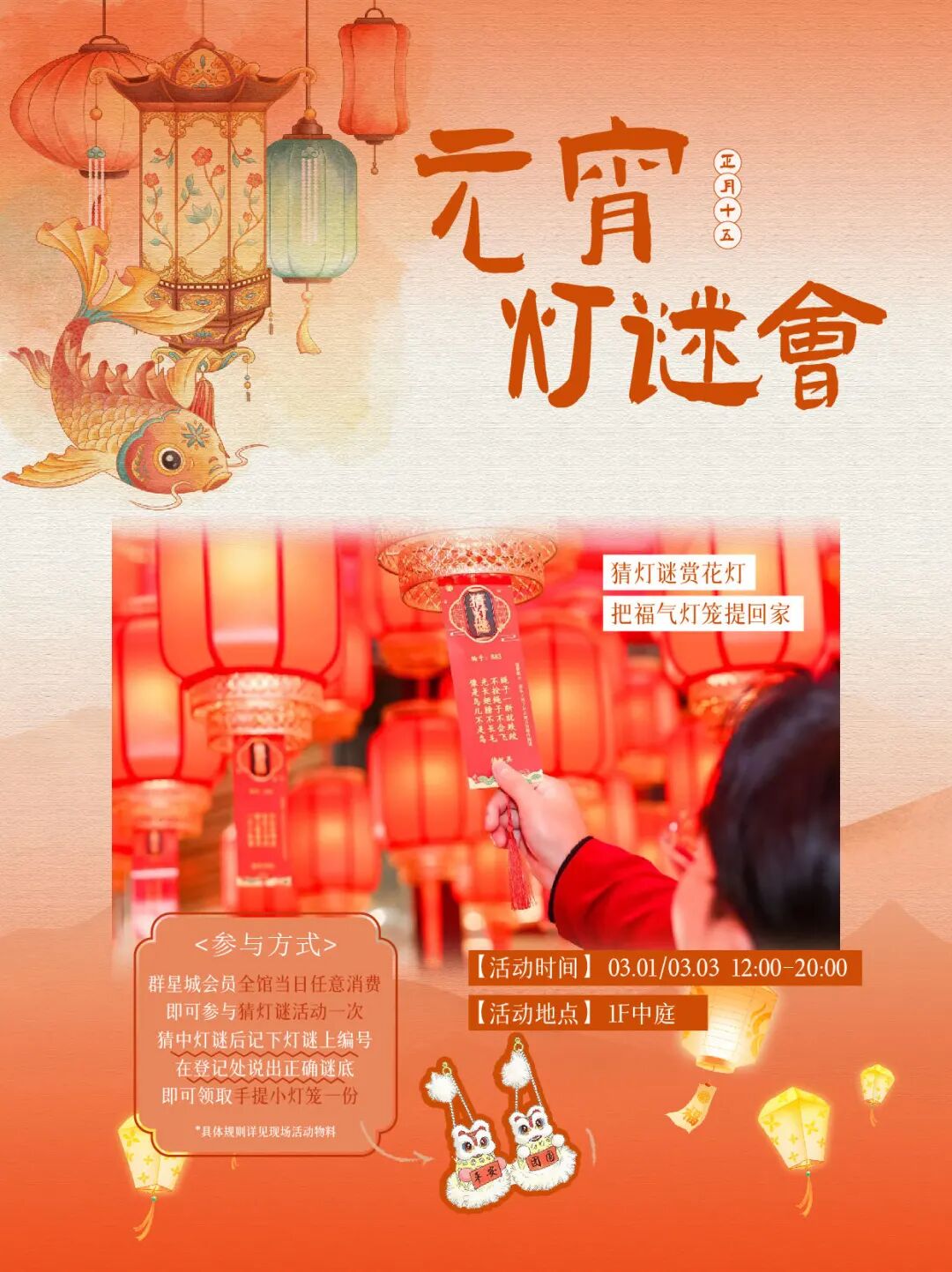 猜灯谜:上元寻灯·谜影入春,猜灯谜赢取添彩好礼;吃元宵:元宵甜·人心暖,百份汤圆免费送圆满。