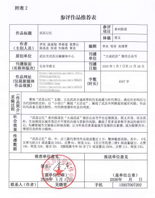 公示期为2026年3月17日至2026年3月19日,在此期间,如对参评作品有异议,请将意见反馈至武汉市武昌区融媒体中心。