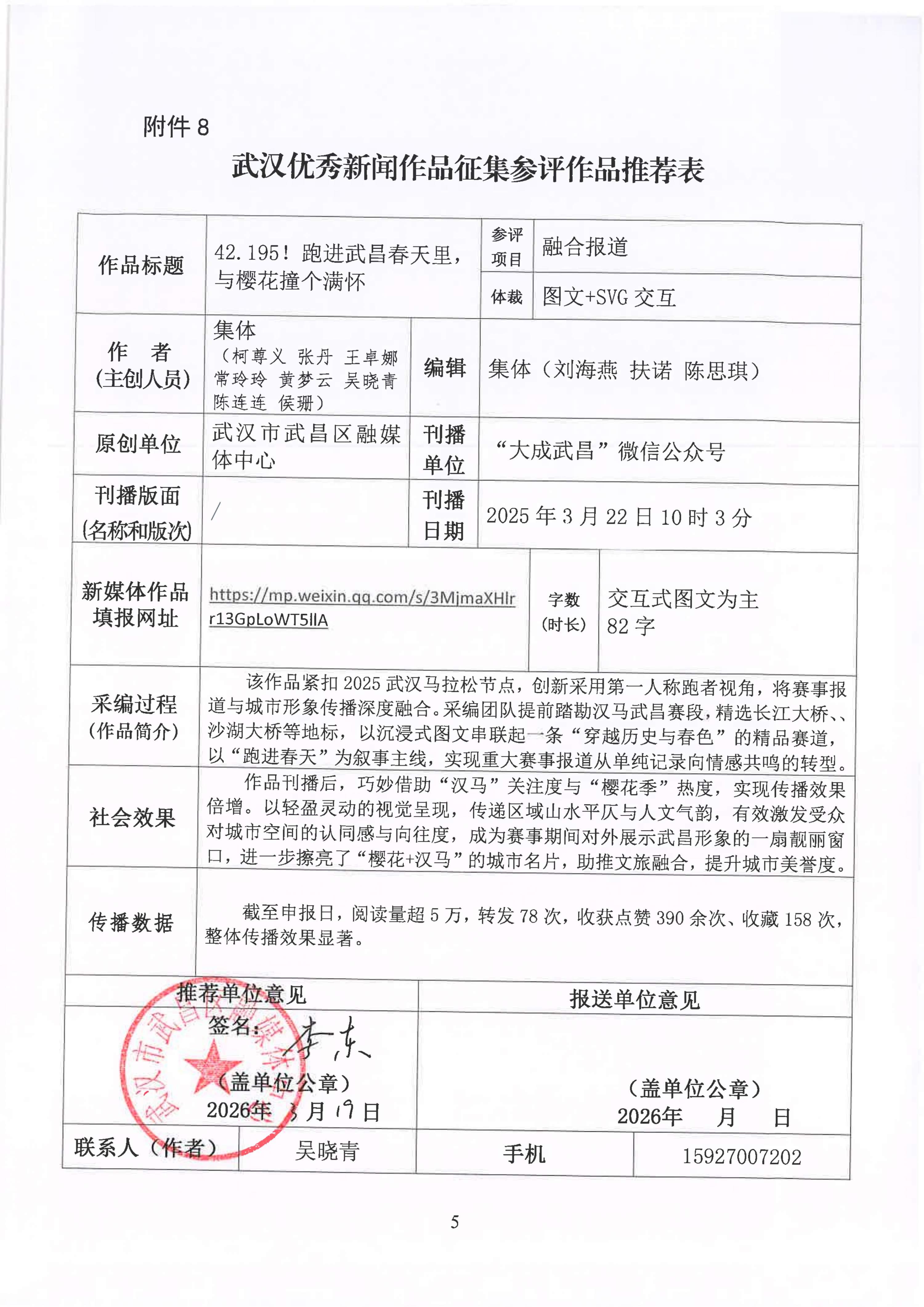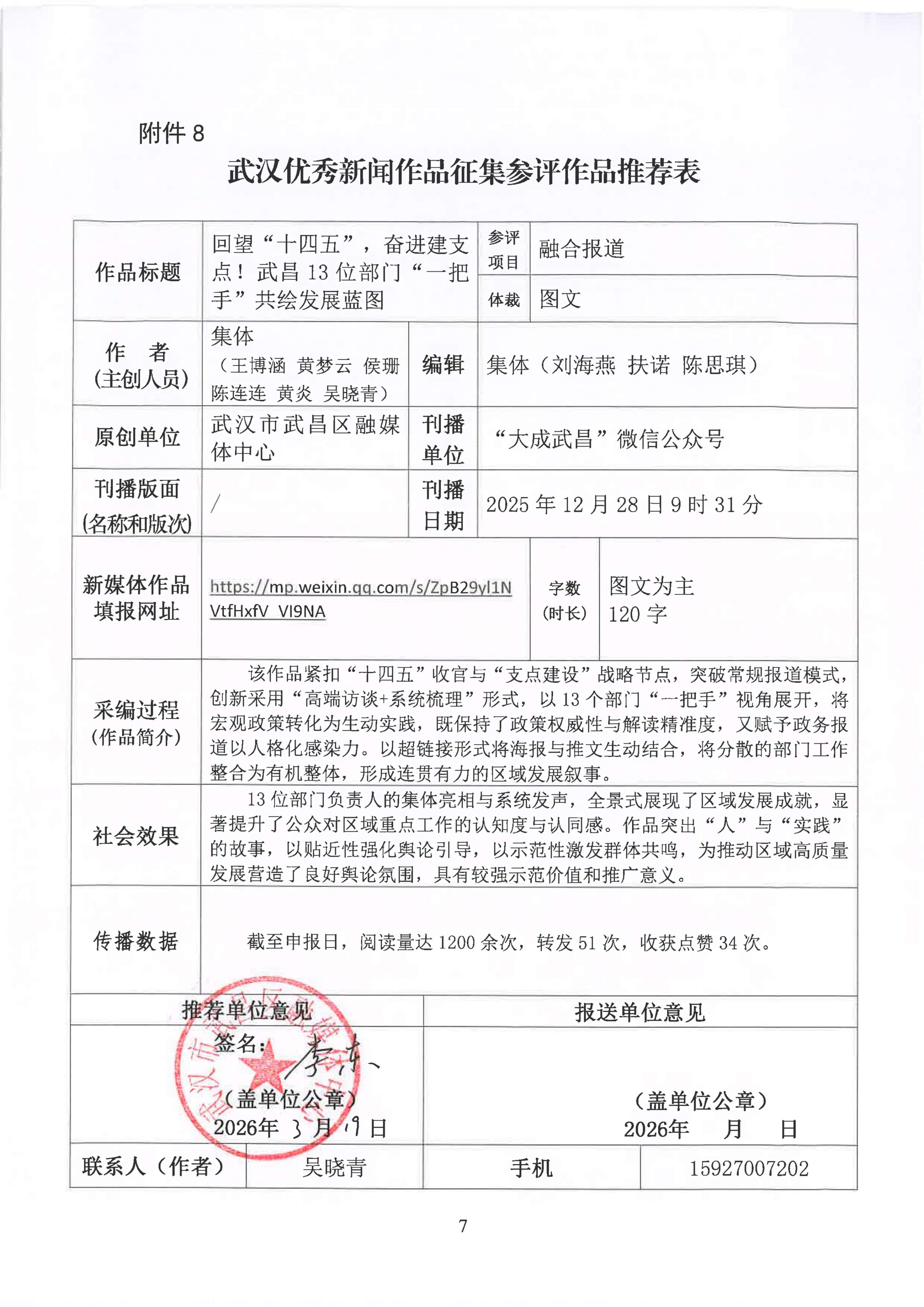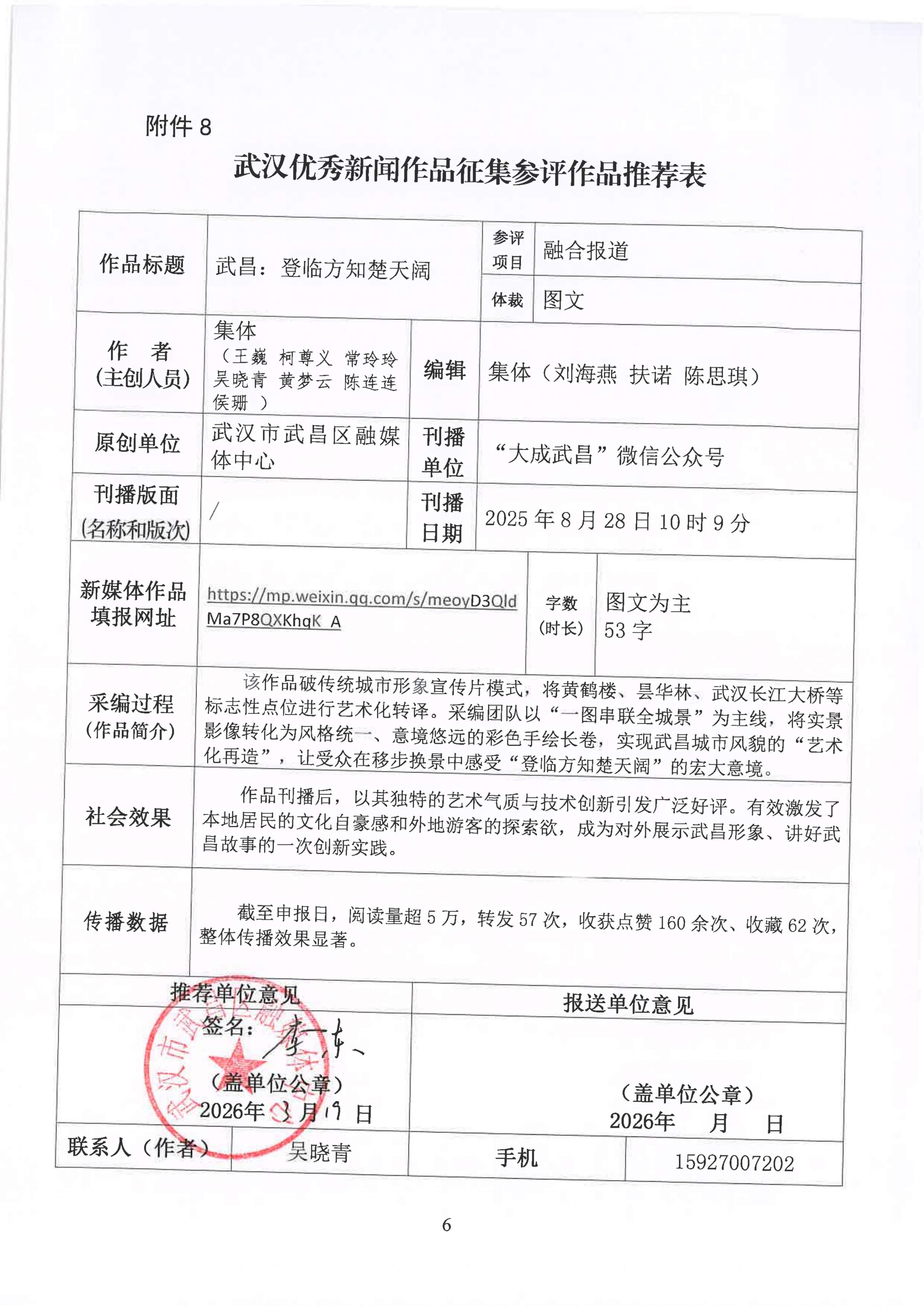 根据《2025年度武汉优秀新闻作品征集办法》相关要求,“大成武昌”微信公众号于2025年12月31日发布的《2025年的最后一天,我在武昌当首席主理人(文末福利)》、2025年3月22日发布的《42.195!跑进武昌春天里,与樱花撞个满怀》、2025年8月28日发布的《武昌:登临方知楚天阔》、2025年12月28日发布的《回望“十四五”,奋进建支点!武昌13位部门“一把手”共绘发展蓝图》和2025年11月26日发布的《武昌记忆,我们打包好了》,拟自荐参评2025年度武汉优秀新闻作品初评,现予以公示。