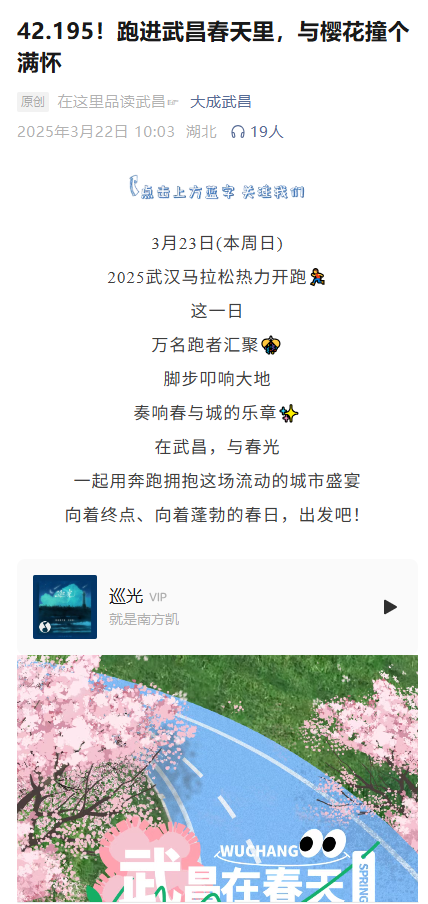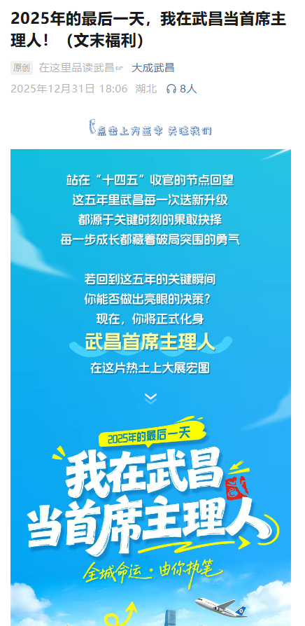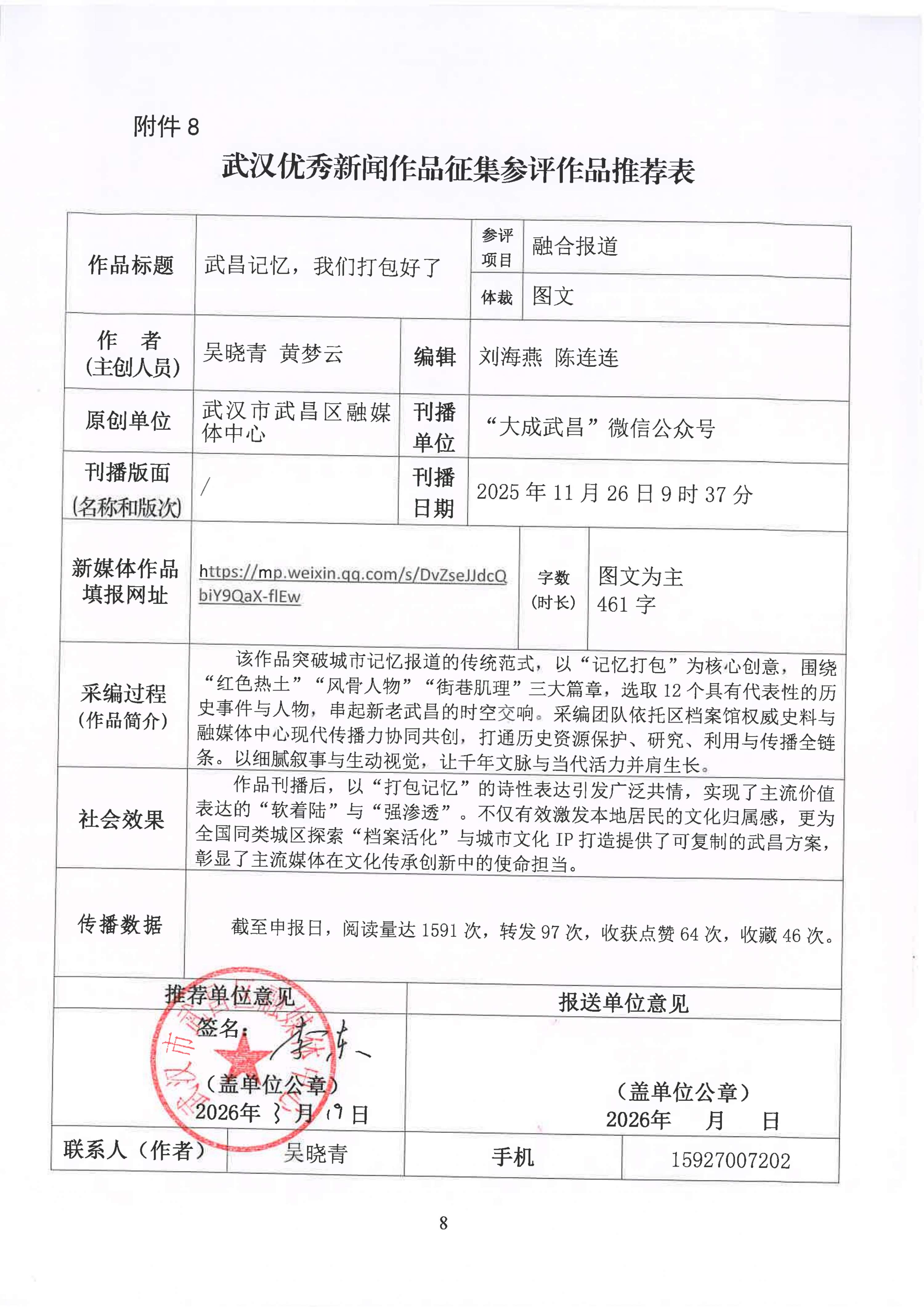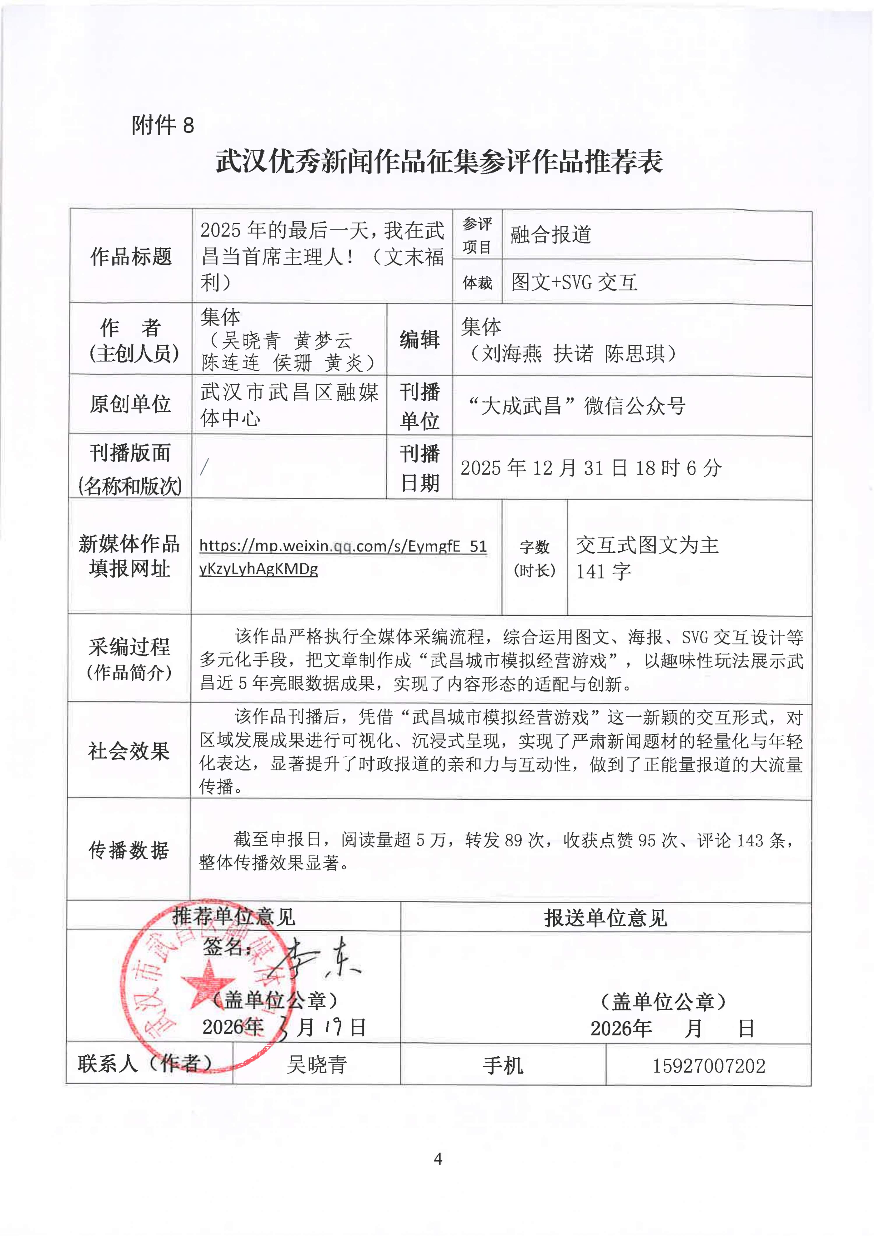 根据《2025年度武汉优秀新闻作品征集办法》相关要求,“大成武昌”微信公众号于2025年12月31日发布的《2025年的最后一天,我在武昌当首席主理人(文末福利)》、2025年3月22日发布的《42.195!跑进武昌春天里,与樱花撞个满怀》、2025年8月28日发布的《武昌:登临方知楚天阔》、2025年12月28日发布的《回望“十四五”,奋进建支点!武昌13位部门“一把手”共绘发展蓝图》和2025年11月26日发布的《武昌记忆,我们打包好了》,拟自荐参评2025年度武汉优秀新闻作品初评,现予以公示。